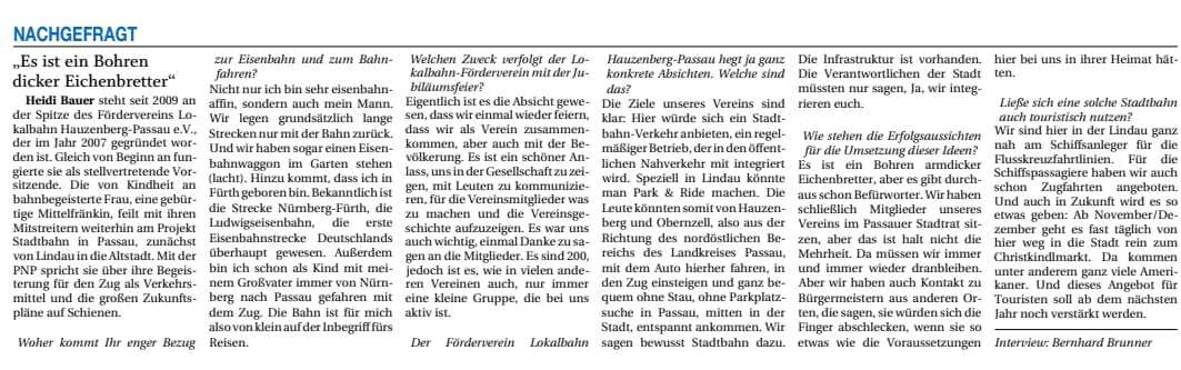 Interview mit Heidi Bauer zum Artikel "Granitbahn-Jubiläum bot neue Perspektiven". PNP - Passauer Neue Presse 11.08.2024 19:00 Autor: Bernhard Brunner