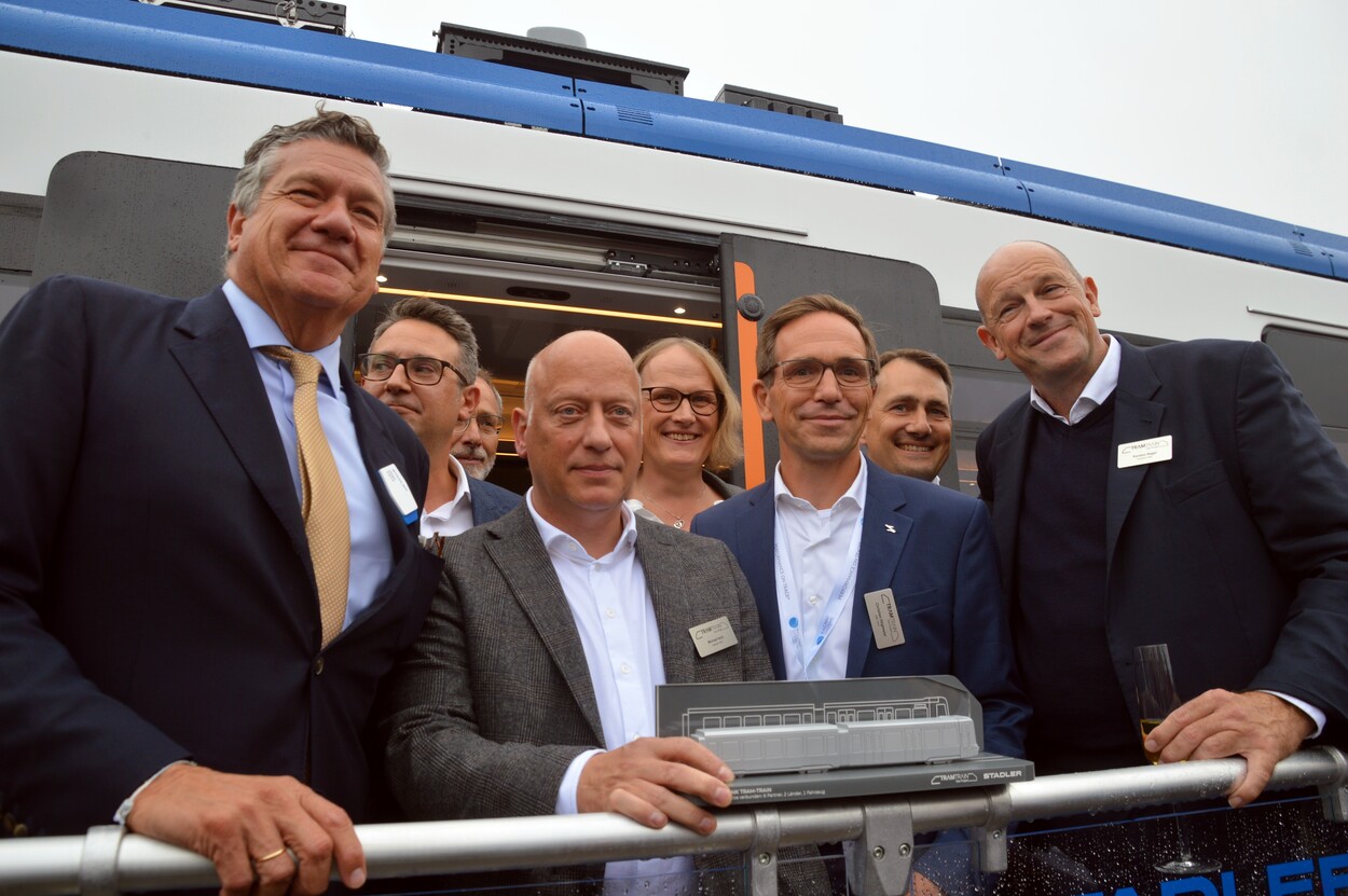Gemeinsam mit dem Fahrzeughersteller Stadler stellten hochrangige Vertreter*innen der TramTrain-Kooperation erstmals ein Zweisystemfahrzeug des TramTrain-Projekts der Öffentlichkeit vor. Das neue Fahrzeug geht in Kürze zuerst bei der Saarbahn in Betrieb. Die Auslieferung weiterer TramTrain-Fahrzeuge an weitere Projektpartner erfolgt ab dem kommenden Jahr.