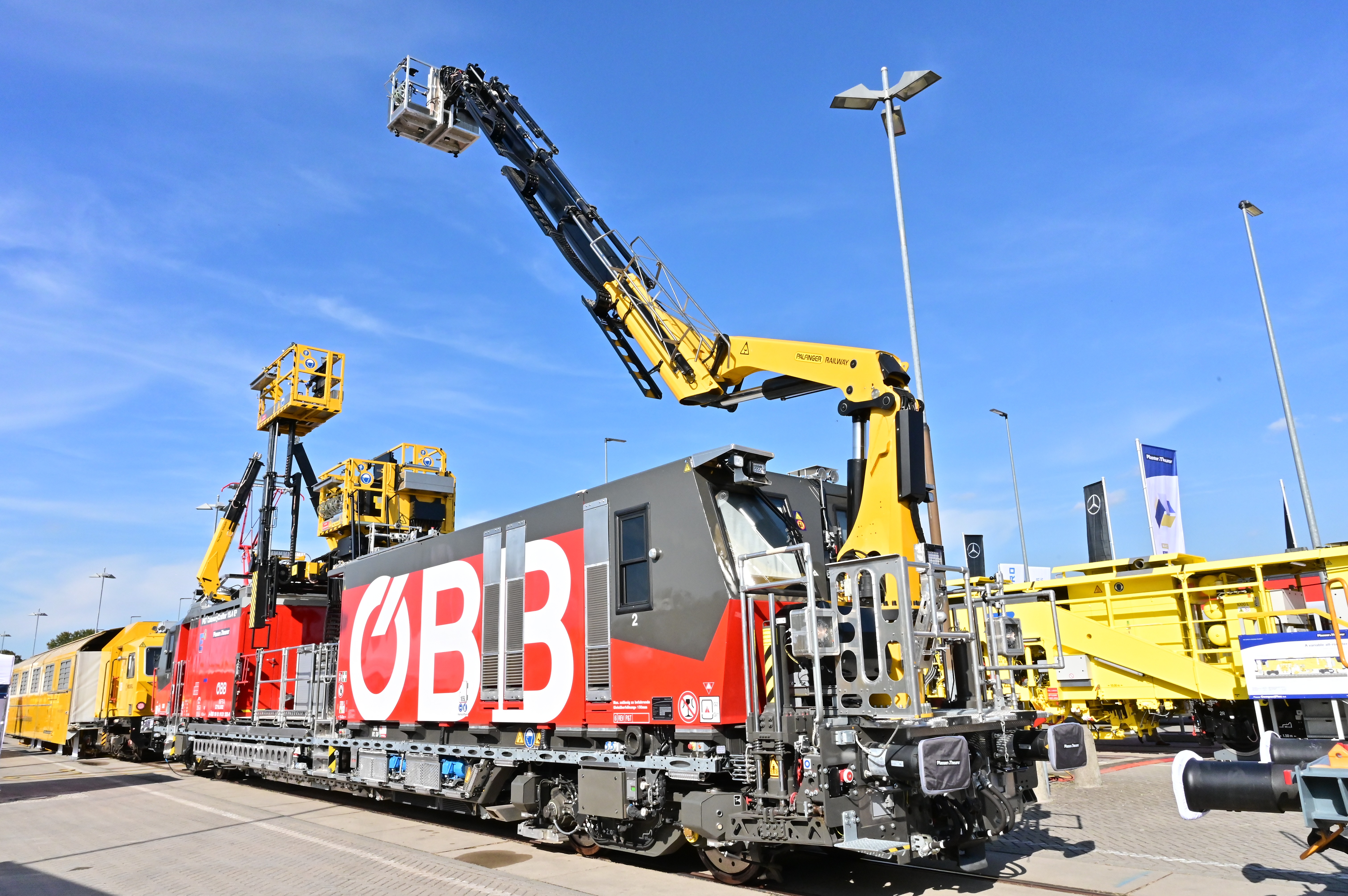 Der Plasser CatenaryCrafter 15.4 E3 der ÖBB auf dem Freigelände der InnoTrans 2024 mit ausgefahrenen Arbeitsaggregaten.
