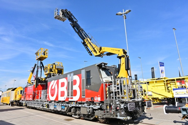 Herausragendes Exponat auf dem Freigelände war der Plasser CatenaryCrafter 15.4 E³ für die ÖBB. 56 Maschinen unterschiedlicher Ausführungen sind als Erstabruf verbindlich bestellt, mehrere bereits im (Probe-)Einsatz. Auf der InnoTrans 2022 hatten Johannes Max-Theurer und ÖBB-Vorstandsvorsitzender Andreas Matthä das Modell präsentiert, genau zwei Jahre später stellten beide nun gemeinsam das Fahrzeug in Original-Größe vor. Das High-Tech-Hybridfahrzeug setzt Maßstäbe, fährt und arbeitet elektrisch mit Energie aus der Oberleitung oder aus den Traktionsbatterien an Bord. Nur in Ausnahmefällen wird der Verbrenner anspringen.
