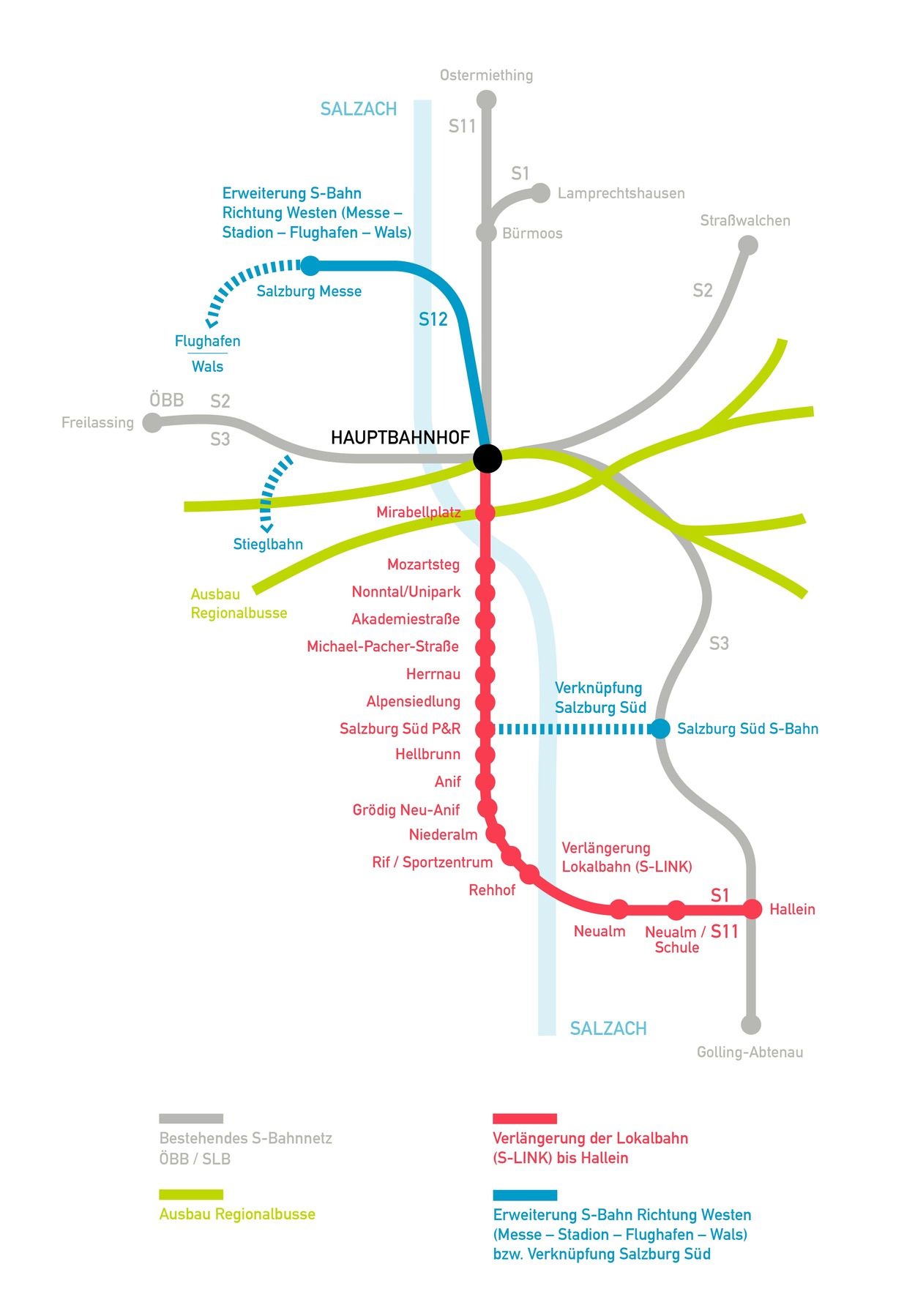 Vereinfachte Darstellung der umfassenden Salzburger Mobilitätslösung mit der Verlängerung der Lokalbahn (S-LINK) bis Hallein in Rot. © Salzburger Verkehrsverbund