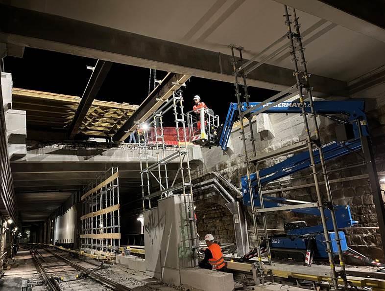 Arbeitsgeschoße einrichten: Im U4-Tunnel errichten wir zwei Arbeitsgeschoße: eines auf Höhe des Kanals, eines auf Höhe der Gleise. Dieser Schritt ist sehr aufwändig. Dann geht es an die Hauptarbeiten:
