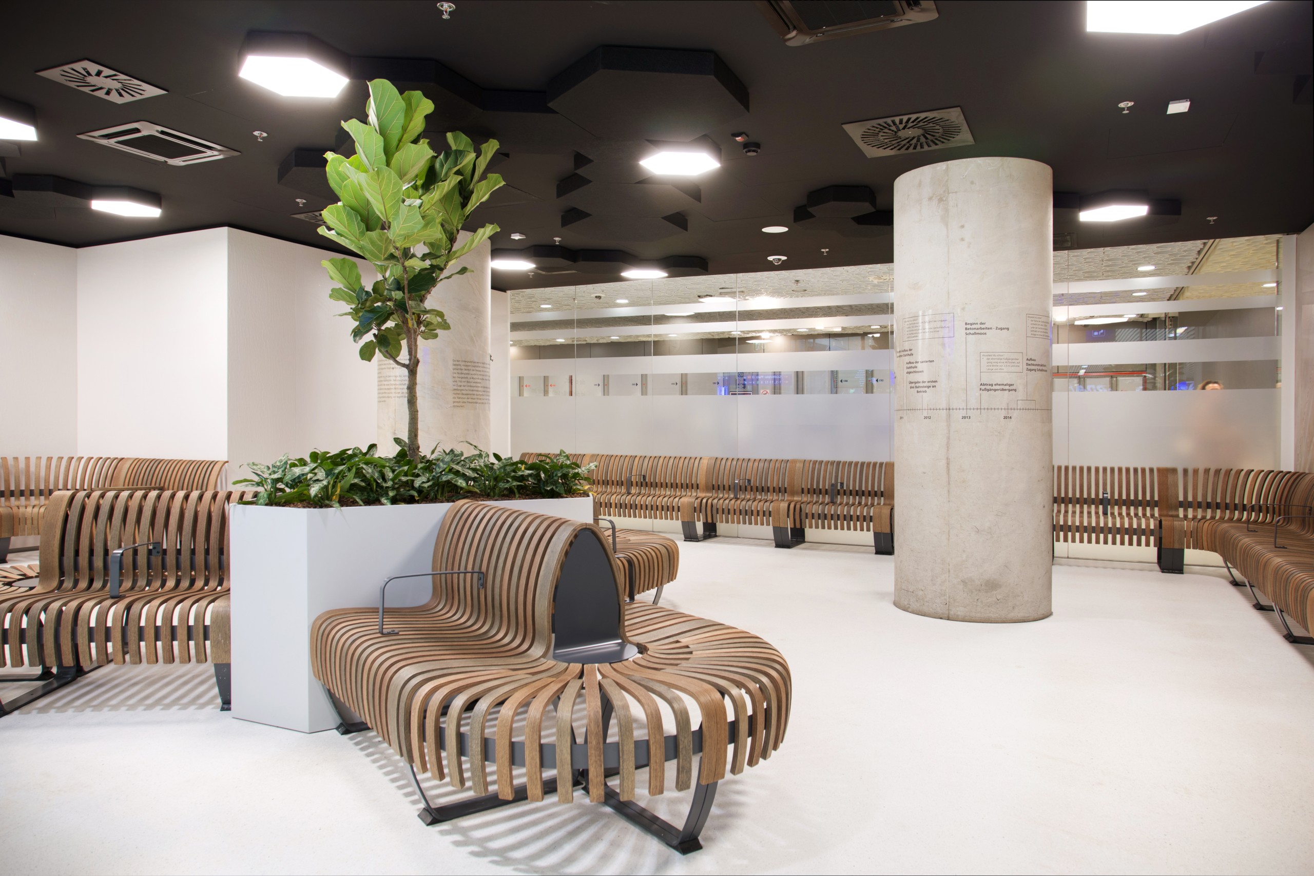 Das neue Raumkonzept legt besonderen Wert auf eine freundliche und angenehme Atmosphäre. Die Wände wurden mit edlen Faserzementplatten verkleidet und in hellen, frischen Farben gestaltet. Dies wird durch ein modernes Lichtkonzept unterstützt, das den Raum erhellt und ihn sowohl tagsüber als auch abends zu einem angenehmen Aufenthaltsort macht. Sowohl neben dem Eingang als auch in der Mitte des Raumes wurden eine großzügige Bepflanzung integriert, um das Wohlbefinden der wartenden Kund:innen zusätzlich zu steigern.
