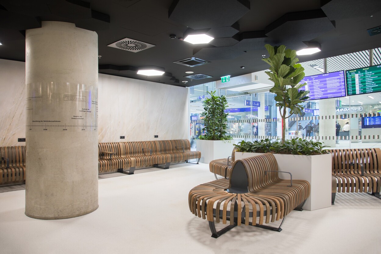 Der neugestaltete Warteraum bietet neben einem modernen Design auch zahlreiche funktionale Verbesserungen, die das Warten angenehmer und komfortabler machen. Der Umbau des Warteraums war notwendig geworden, um den steigenden Anforderungen der Fahrgäste und der wachsenden Anzahl an Reisenden gerecht zu werden. Die neue Fläche von knapp 93 Quadratmetern, nahezu doppelt so groß wie zuvor, schafft deutlich mehr Platz für die Gäste des Bahnhofs. Die Sitzplatzanzahl wurde von 33 auf 66 verdoppelt, wobei hochwertige und nachhaltige Holzelemente als ergonomisch gestaltete Sitzgelegenheiten den Reisenden größtmöglichen Komfort bieten.