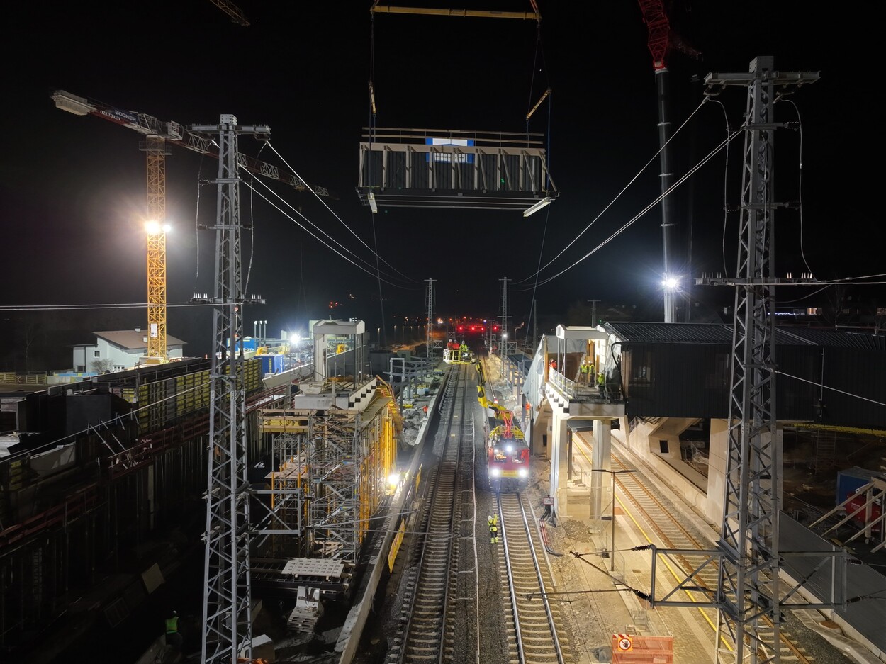 Erfolgreicher Meilenstein beim Umbau des Bahnhofs Fritzens-Wattens: Ein 13 Meter langer Abschnitt des neuen Fuß- und Radstegs wurde eingehoben. Die Fertigstellung der barrierefreien Mobilitätsdrehscheibe ist für Ende 2025 geplant.