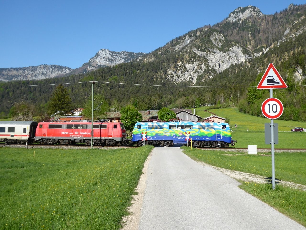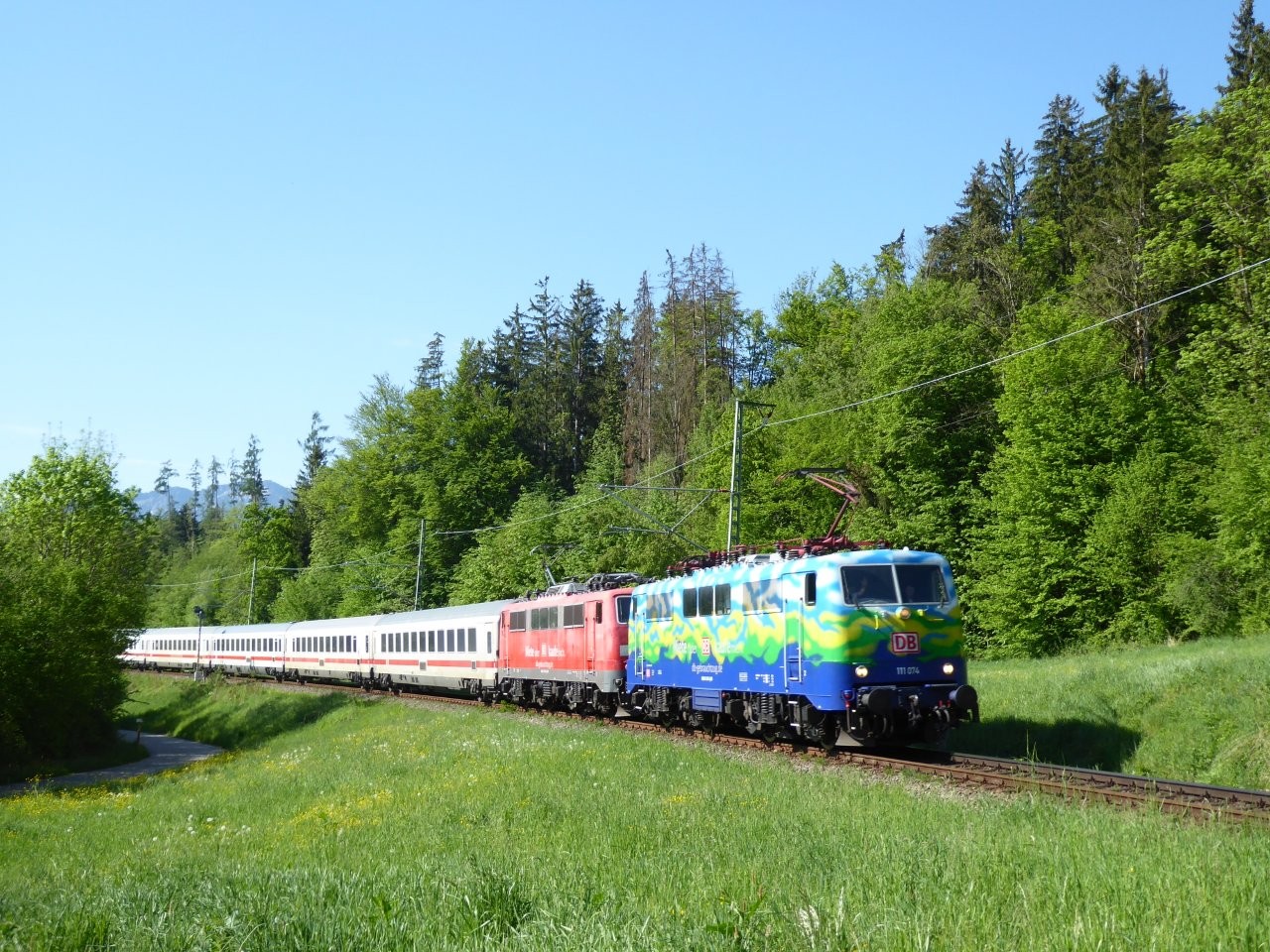 Begründet wird diese interessante aber nicht wenig aufwendige Maßnahme mit der Geringeren Achslast von 0,2 t (!?) zwischen der Baureihe 101 und 111. DB-Fernverkehr hat zum Zweck dieser Übung drei 111er von DB-Gebrauchtzug angemietet und in Freilassing stationiert. Aktuell sind dies 111 067 (rot), 111 074 (Tourismus) und 111 212 (TEE). Neben den beiden IC-Zügen werden natürlich auch die Zu-und Rückführungen nach und von Berchtesgaden als RE 2191/92 mit der Doppelbespannung geführt.