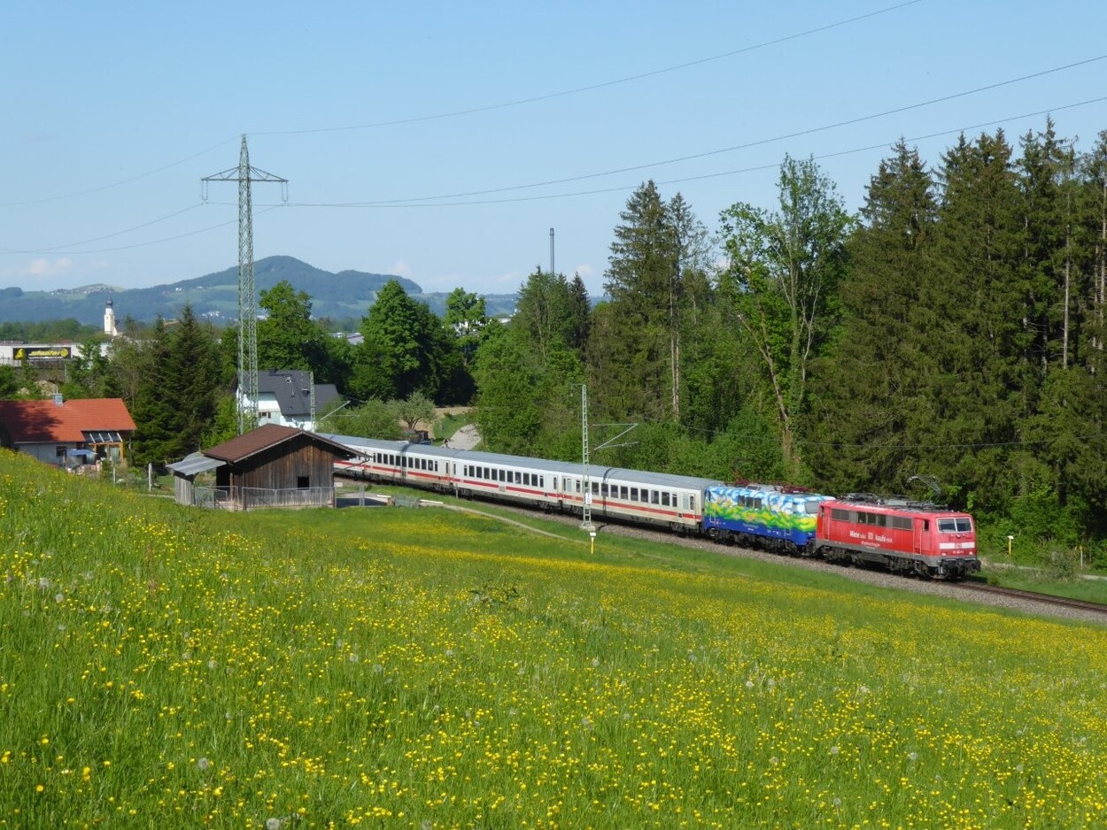Vor der grandiosen Kulisse der Berchtesgadener Berge beginnt der IC „Königssee“ seine lange Reise an die Alster – mit 111 074 + 111 067 bei Winkl; 2. Mai 2025