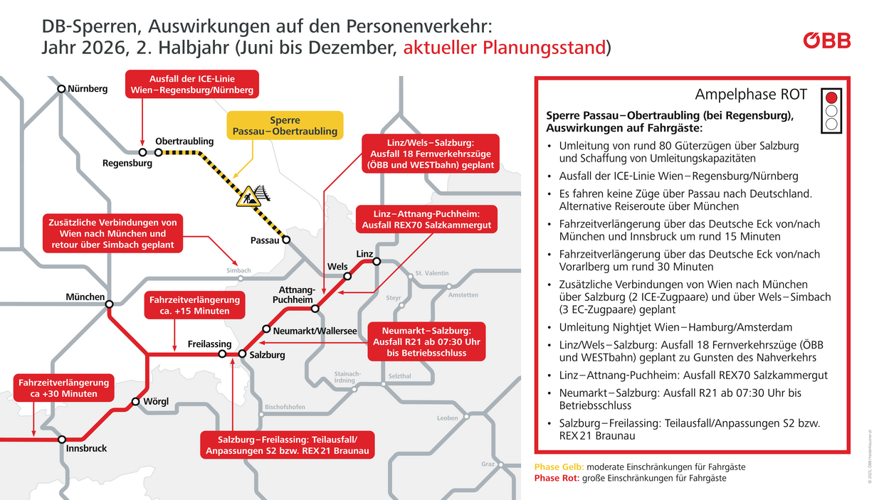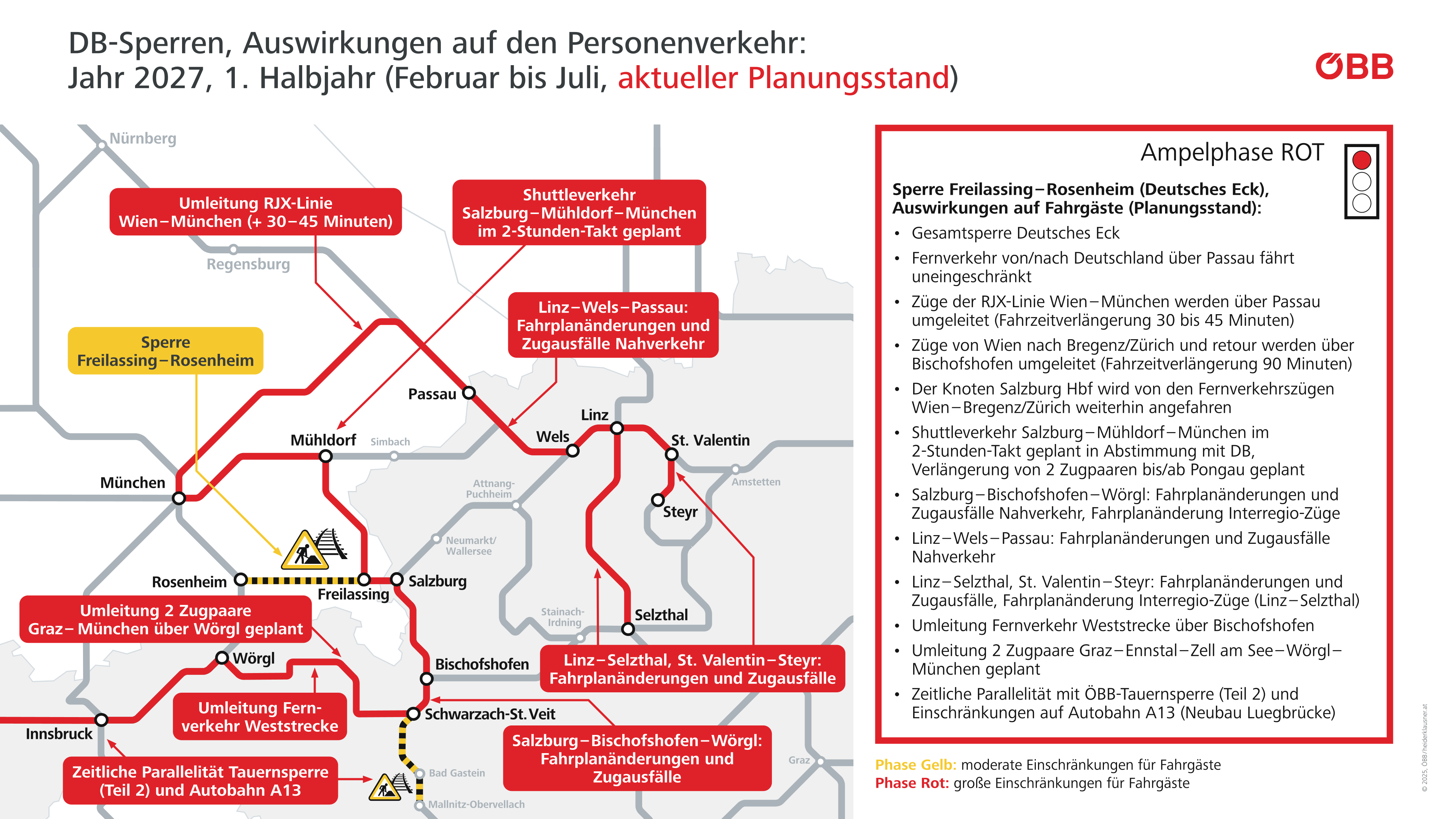 Mit dem Auftakt der Streckensanierungen und der dafür notwendigen Streckensperren in Bayern beginnt im kommenden Jahr eine Phase mit Auswirkungen auf Salzburg. Das Land Salzburg, die Industriepartner und die ÖBB arbeiten eng zusammen, um diese Auswirkungen so gering wie möglich zu halten. Gemeinsames Ziel ist es, die Mobilität für Pendler:innen, Reisende und die Wirtschaft in Salzburg bestmöglich aufrecht zu erhalten. Das Angebot im Bundesland Salzburg bleibt während der Einschränkungen weiterhin hoch und dicht, sowohl im Nahverkehr als auch im Fernverkehr.