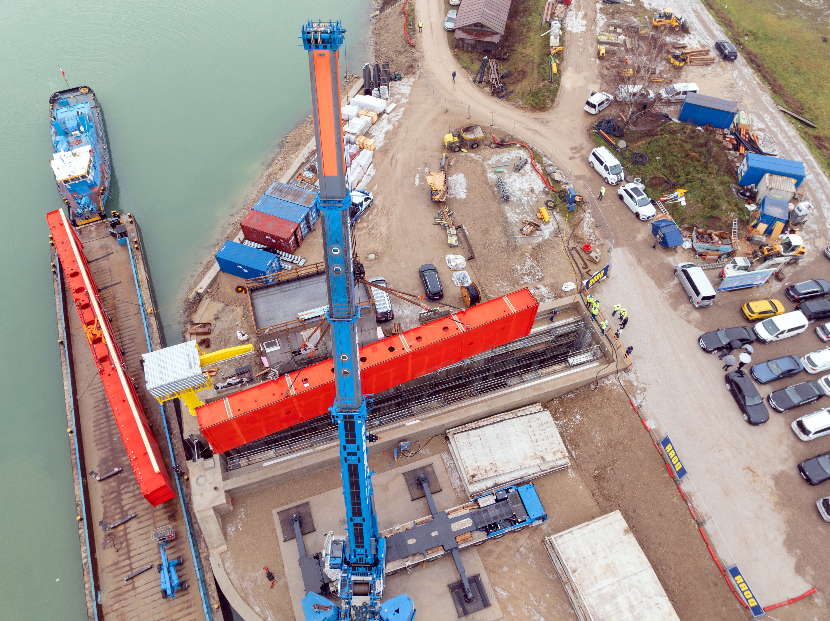 Produziert wurde das Hafentor in der Türkei und in zwei Teilen liegend nach Österreich verschifft. Mit einem Tag Verspätung kam das Donauschiff im Schwerlasthafen Linz an. In der Nacht auf den 8. Januar erfolgten die Entladung und das Aufdrehen der beiden Teile beim Felbermayr Schwergutterminal im Schwerlasthafen Linz. „Dafür wurden neben dem 400 Tonnen Portalkran auch zwei Mobilkrane mit 150 beziehungsweise 160 Tonnen maximaler Traglast eingesetzt“, erzählt Michael Maier-Bauer, Projektleiter der Felbermayr Transport- und Hebetechnik Linz. Anschließend galt es, die Hafentorteile auf den mit dem Schubschiff "Grafenau" verhefteten Leichter zu verladen. „Grafenau" transportierte die Hafentorteile vom Schwerlasthafen zur Baustelle im Handelshafen. Höhepunkt des Auftrags war der Einhub des neuen Hafentors bei der Einfahrt in den Linzer Handelshafen mit einem 650 Tonnen Mobilkran LTM 1650 in die Hafentorkammer. Der Kran erreichte eine maximale Ausladung von 18 Metern und war mit 135 Tonnen ballastiert.