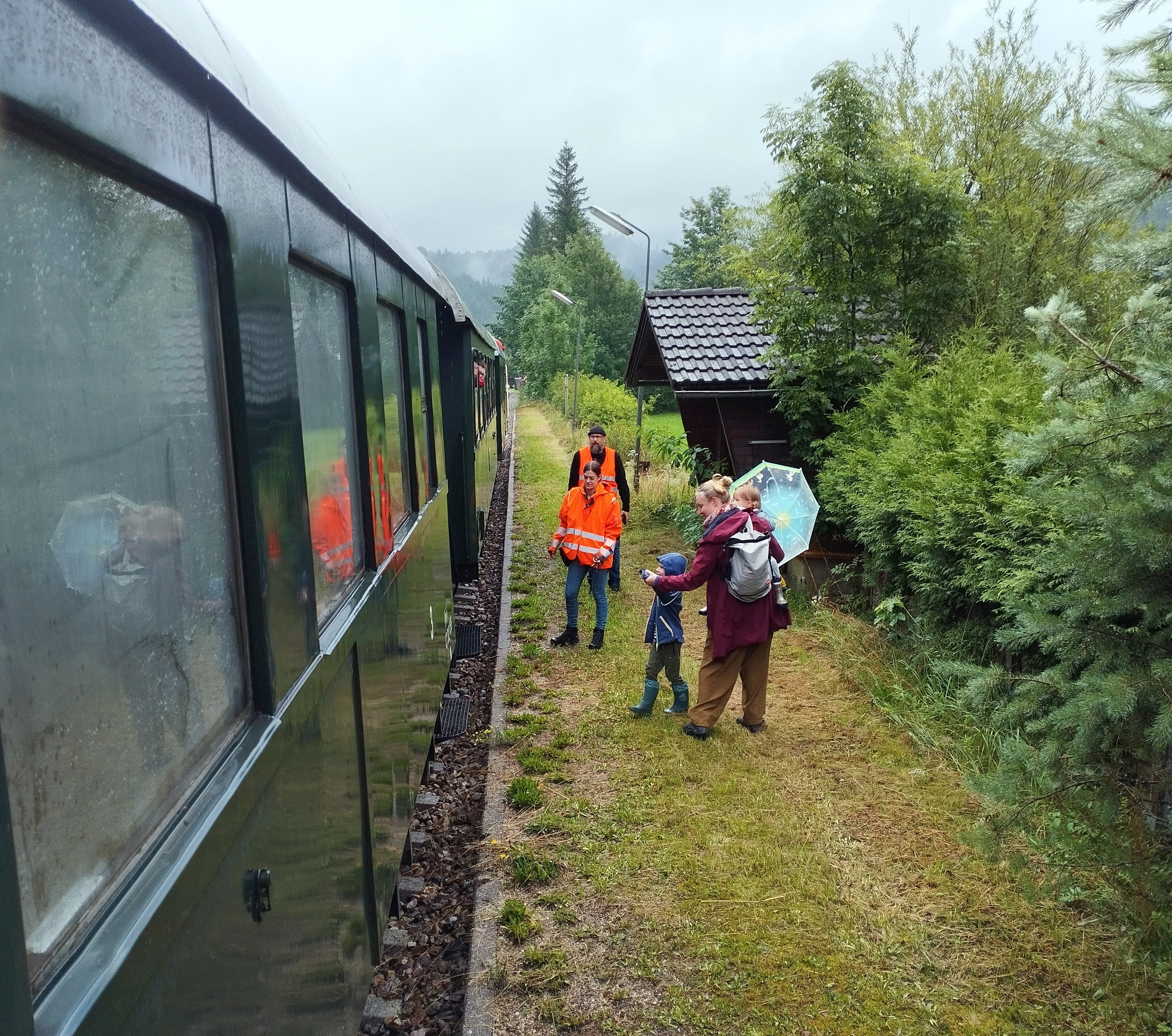 Der erste Zug des Tages am 27.7.2025 bei starkem Regen auf dem Weg nach Hohenberg zur 700-Jahr-Feier (Plakat am linken Bildrand).
