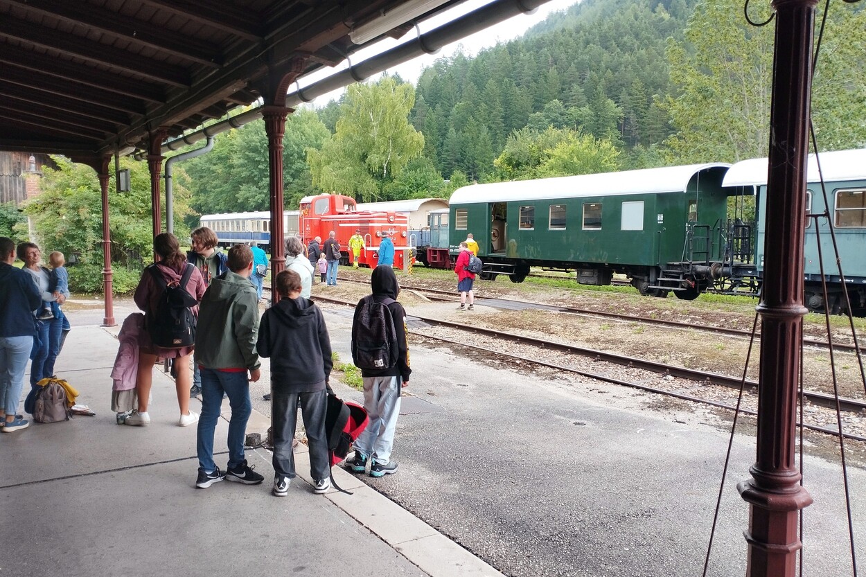 Fahrgast-Andrang in St. Aegyd am Neuwalde am 27.7.2025. Personenzüge gibt es leider nicht an jedem Tag. Nächste Fahrten am Sonntag, 17.8.2025 zum Bauernmarkt.