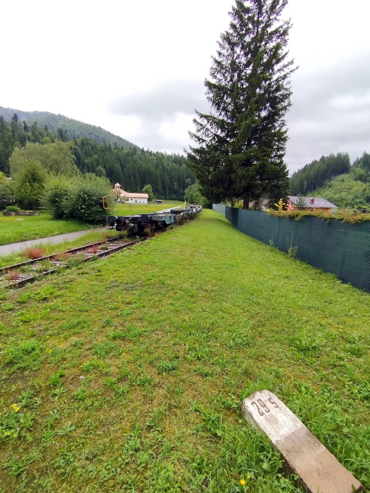 Haltestelle Markt St. Aegyd am Neuwalde, das derzeitige Streckenende. Am 27.7.2025 mit abgestellten Güterwagen. Fortsetzung im Hintergrund leider nur mehr als Radweg bis zum ehemaligen Endbahnhof Kernhof. Personenzüge bis zu dieser Haltestelle wieder am So, 17.8.2025, direkt zum St. Aegyder Bauernmarkt.