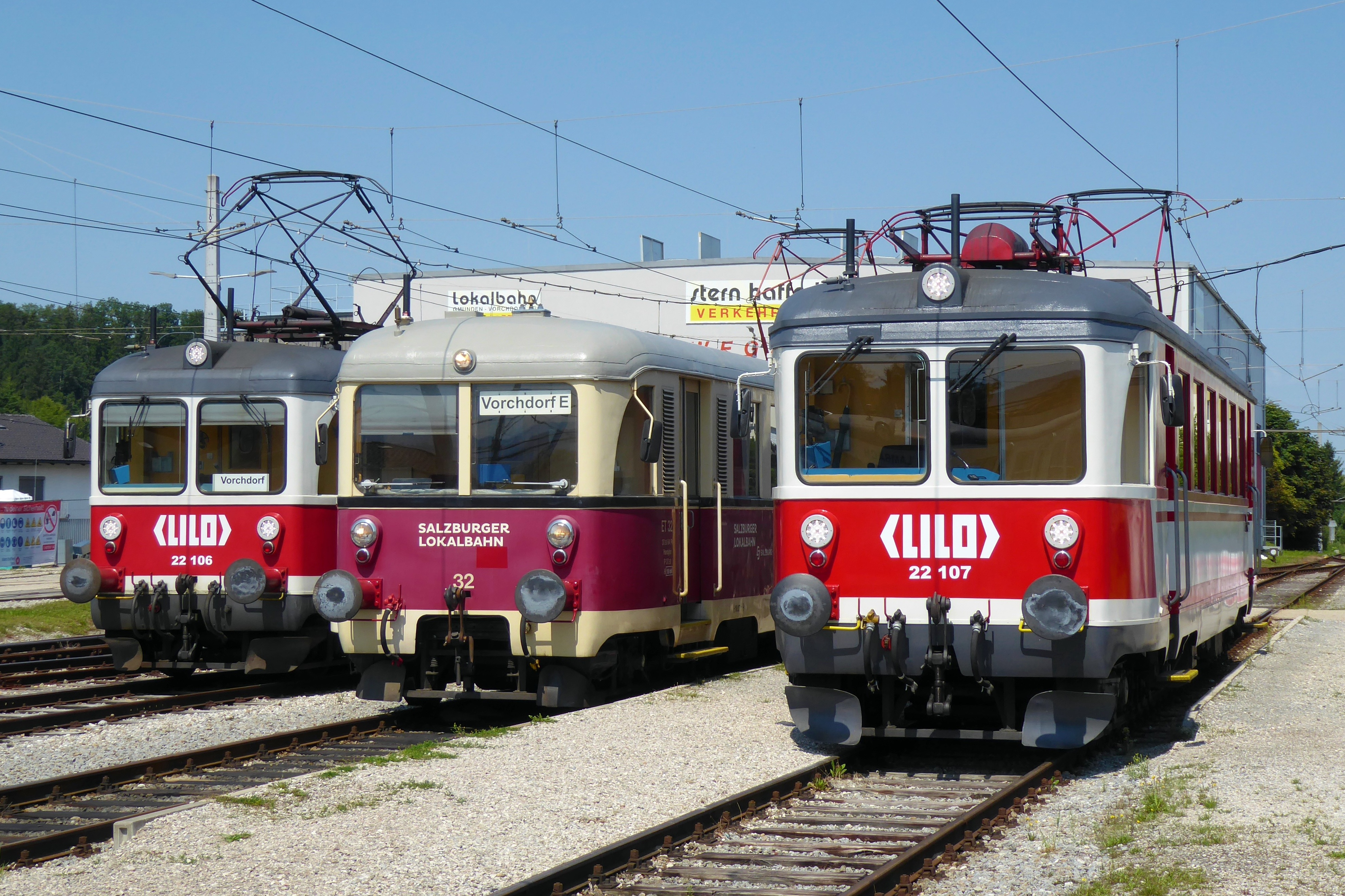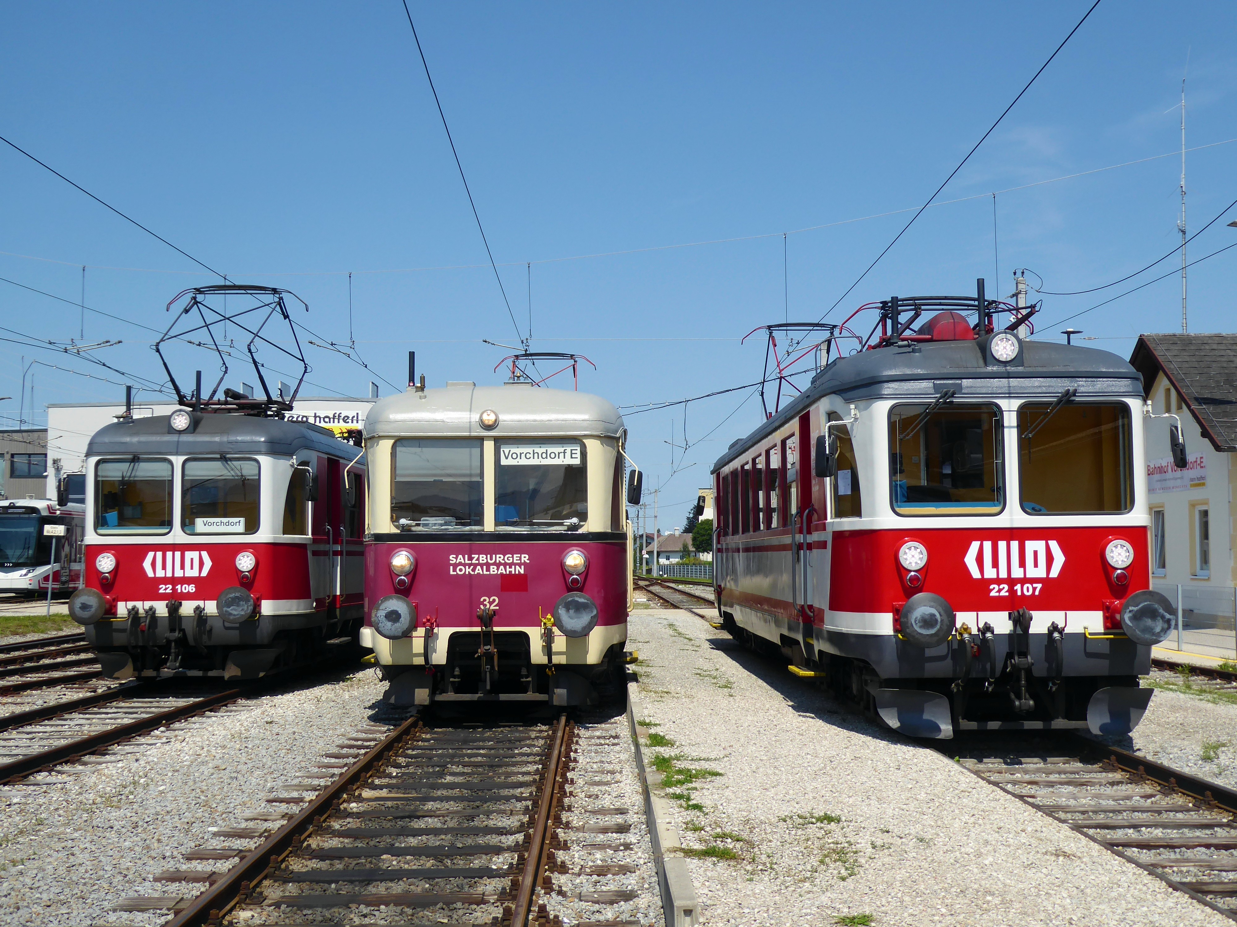 v.l.n.r. : ET 22.106 (Leihtriebwagen der Linzer Lokalbahn); ET 20.114 (vulgo SLB ET 32; Leihtriebwagen der Salzburger Lokalbahn) und ET 22.107 (Leihtriebwagen der Linzer Lokalbahn) im Bf. Vorchdorf-Eggenberg.
