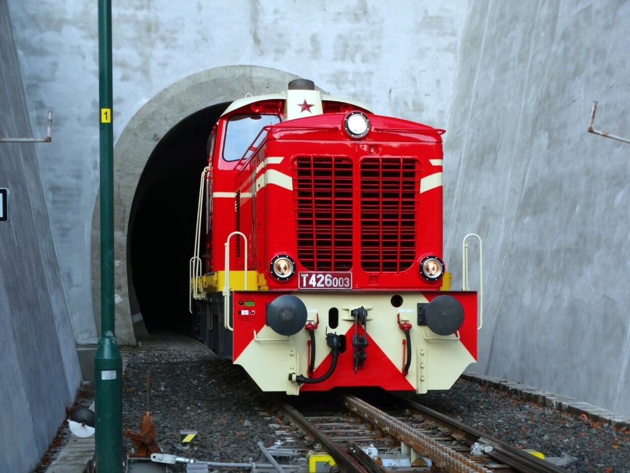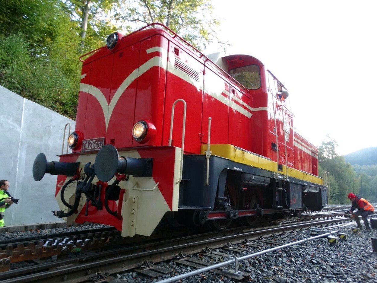 „Am 2. Oktober fand auf der Strecke Tanvald–Kořenov eine weitere Probefahrt mit der Lokomotive der Reihe 715 (in den 1960er-Jahren von SGP in Österreich hergestellt und auf der Erzbergbahn getestet) statt. Ziel war die Überprüfung der Funktionalität von drei speziellen Zahnstangenweichen mit einem Abt-Zahnstangensystem, die wir entworfen, gefertigt und geliefert haben.