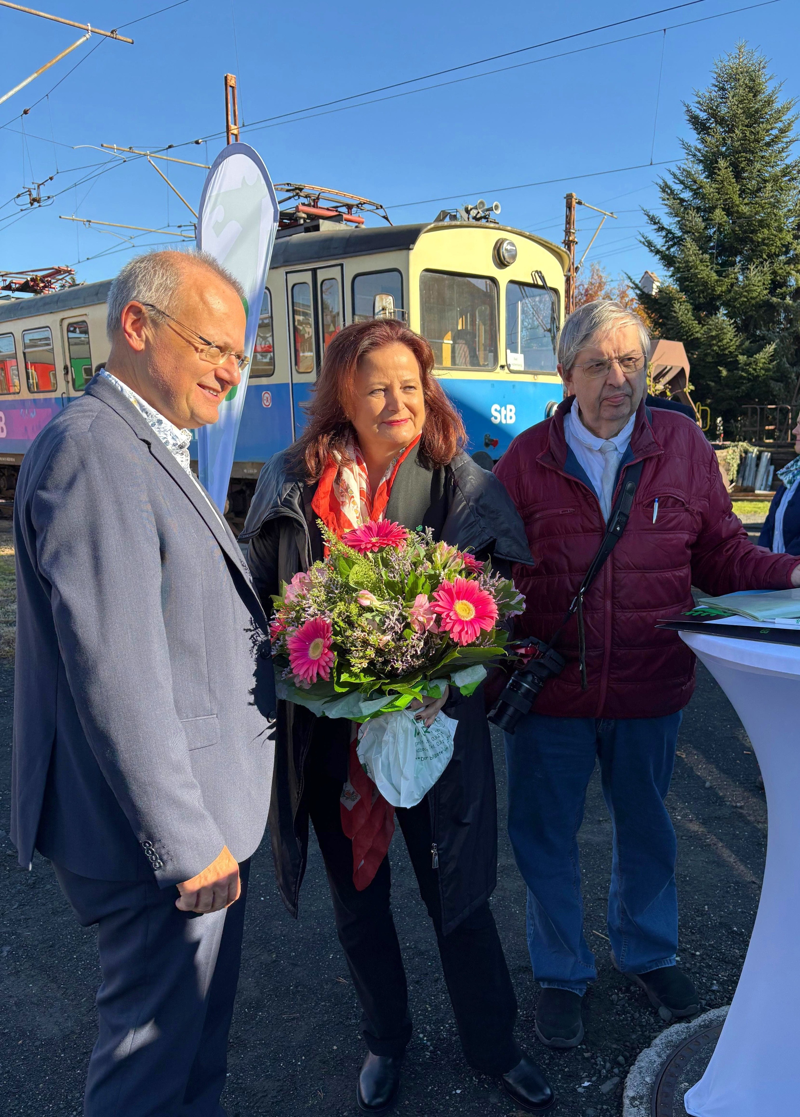 Die große Freude über den Weiterbetrieb hat der Verein Neue Gleichenberger Bahn mit einem Blumenstrauß ausgedrückt - und damit auch Dr. Holzer eine Freude bereitet. Rechts im Bild Vereinsobmann Richard Fuchs.