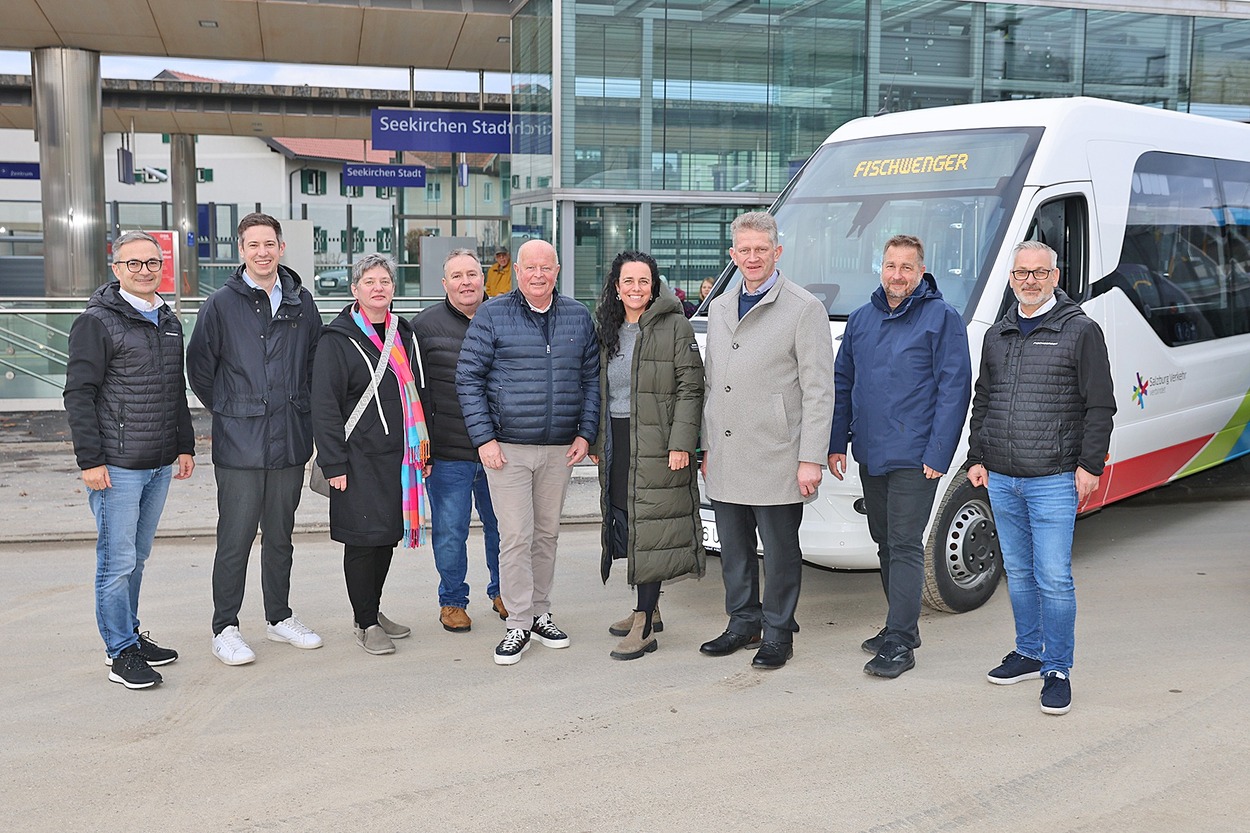 Pressetermin zum neuen Stadtverkehr Seekirchen. (v.l.) Hannes Fischwenger (Geschäftsführer Fischwenger Reisen GmbH), Vbgm. Rupert Freundlinger, BA (1. Vizebürgermeister der Stadtgemeinde Seekirchen am Wallersee), Vbgm. Eva Holzleitner (2. Vizebürgermeisterin der Gemeinde Henndorf am Wallersee), Vbgm. Josef Ebner (1. Vizebürgermeister der Gemeinde Henndorf am Wallersee), Bgm. Konrad Pieringer (Bürgermeister der Stadtgemeinde Seekirchen am Wallersee), Mag. Yvonne Rosenstatter (Bereichsleiterin Kommunikation & Marketing, Salzburger Verkehrsverbund GmbH), Bgm. Martin Köllersberger (Bürgermeister der Gemeinde Henndorf am Wallersee), Ing. Gerold Daxecker (Geschäftsführer des ÖPNV Flachgau II) und Andreas Fischwenger (Geschäftsführer Fischwenger Reisen GmbH)